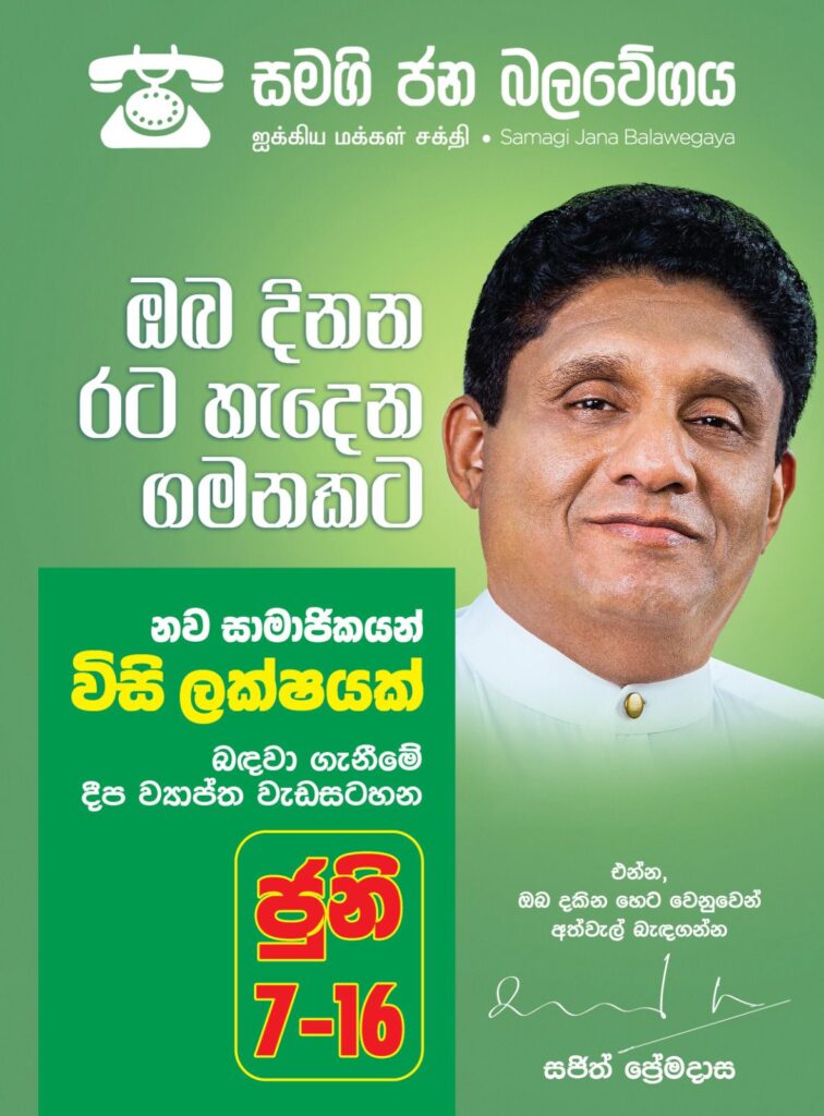 Politics*රට ගොඩනගන්න සමගි ජන බලවේගය හා එක්වන්න – විපක්ෂ නායක සජිත් ප්රේමදාස මහතාගෙන් රටේ ජනතාවට ඇරයුම්* June 7, 2024 *රට ගොඩනගන්න සමගි ජන බලවේගය හා එක්වන්න – විපක්ෂ නායක සජිත් ප්රේමදාස මහතාගෙන් රටේ ජනතාවට ඇරයුම්* Read Post »